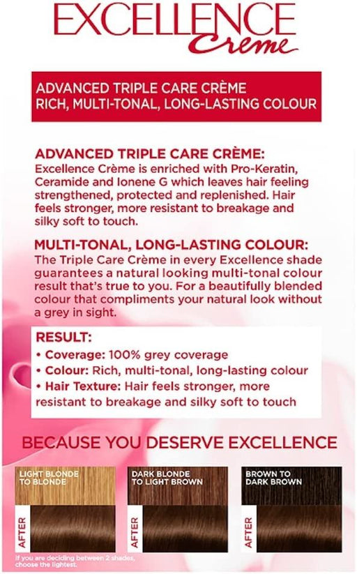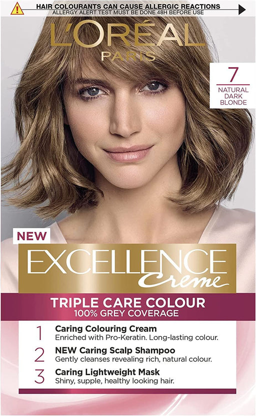 L'Oreal Paris Excellence Crème Permanent Hair Dye - 7 Dark Blonde   Description TRIPLE CARE COLOUR RITUAL HAIR DYE BY EXCELLENCE Cares for your col...