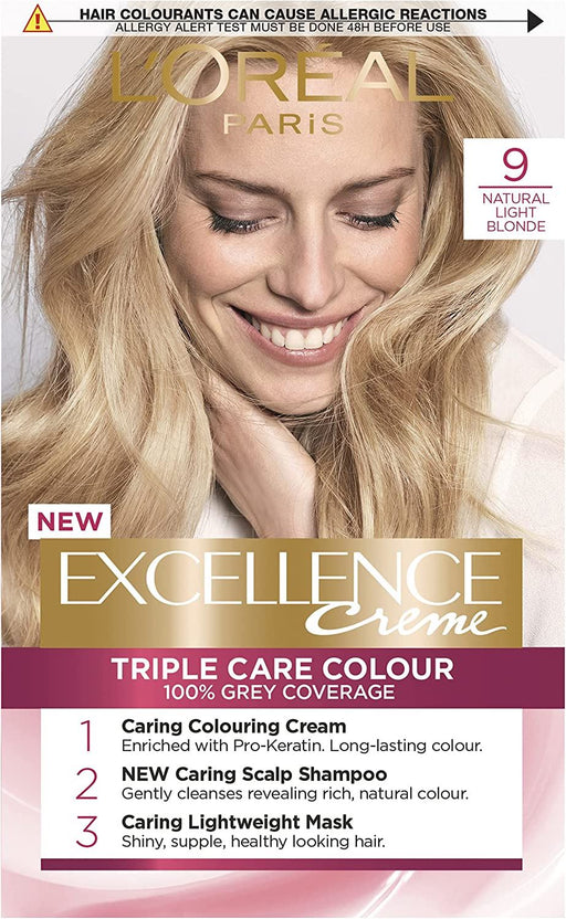 L'Oreal Paris Excellence Crème Permanent Hair Dye - 9 Natural Light Blonde   Description TRIPLE CARE COLOUR RITUAL HAIR DYE BY EXCELLENCE Cares for...