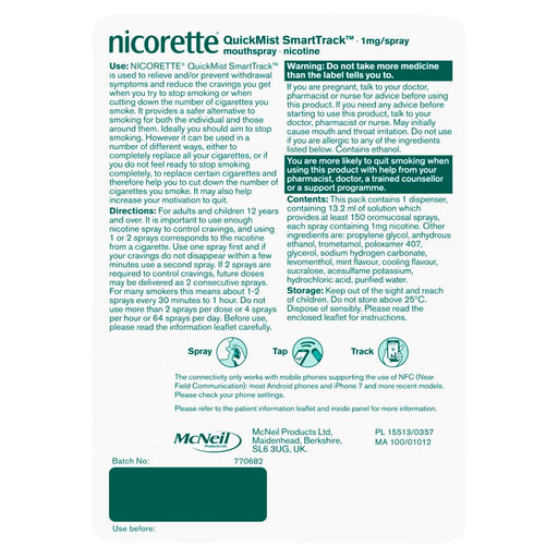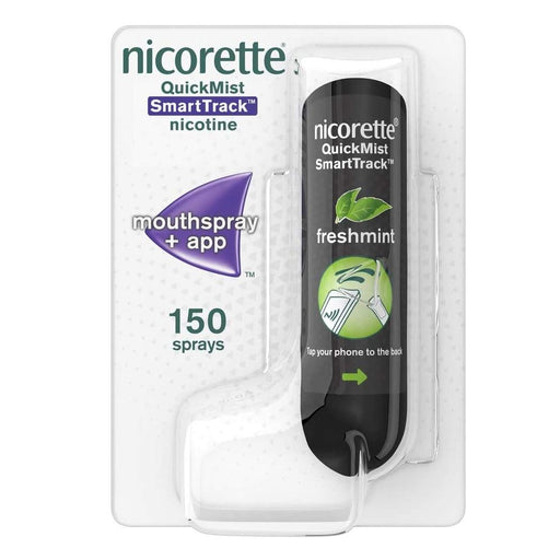 NicoretteIn stockNicorette QuickMist SmartTrack 1mg Mouth Spray Nicotine Freshmint 150 Sprays Description Nicorette QuickMist SmartTrack Mouthspray contains nicot...