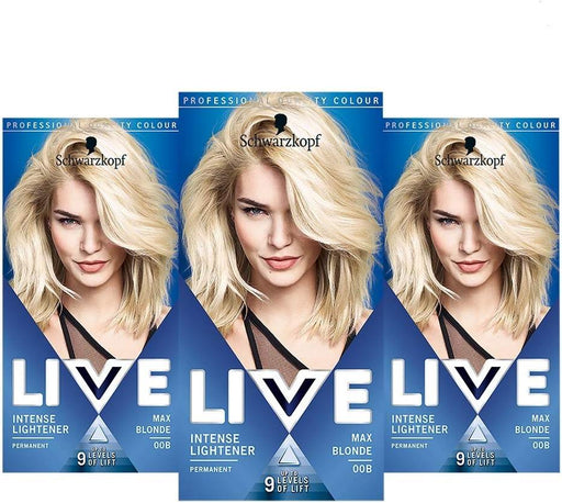 Schwarzkopf Intense Colour Lightener 00B Max Blonde Ultra Shine Hair Dye x 3 Take your colour to the max with LIVE colour XXL. From a subtle change...