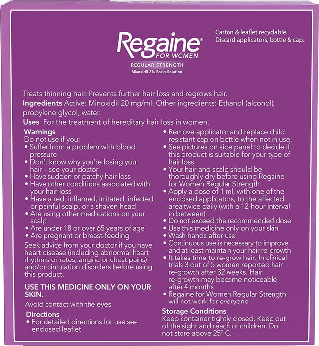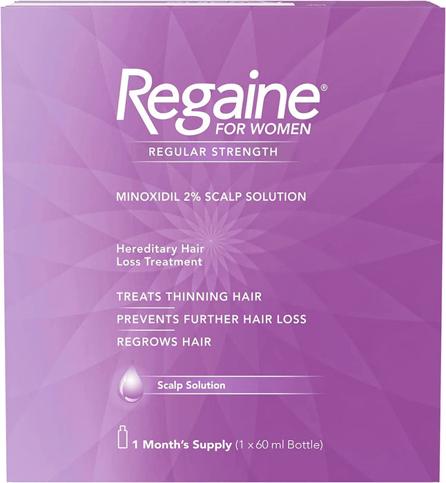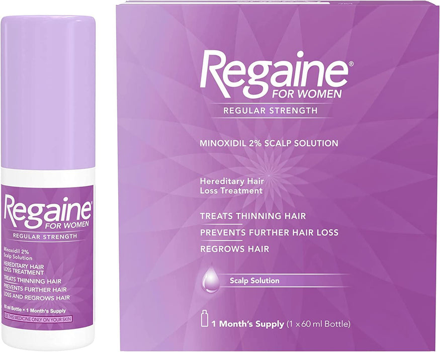 Regaine for Women Regular Strength is used to treat common hereditary hair loss in women aged 18-65 years. It is thought that it works by aiding the blood flow to the cells in your scalp which grow hair. The exact process by which this occurs is not known.Regaine for Women Regular Strength works best in women who have general hair thinning of the scalp.Those who are younger or have been losing hair for a short period of time are likely to respond best to Regaine for Women Regular Strength.Each bottle contains 60ml of solution - sufficient for 1 month of treatment.