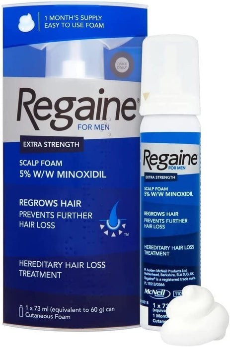 Regaine foam contains minoxidil which increases the flow of blood and nutrients to your hair follicles stimulating them from a resting phase into a hair growth phase. As a result hair regrows thicker over time and existing hair appears fuller.