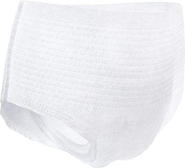 TENA Pants Super are white soft and comfortable disposable incontinence pants for men and women with pull up fit just like regular underwear. With a close body-fit and textile like breathable materials they are designed for soft comfort. Unlike standard adult diapers TENA Pants Super have a highly absorbent core that quickly and effectively locks in liquid for total security. When worn our thin and flexible core shape forms two absorption chambers also known as the Dual Absorption Zone that efficiently channel moisture away from the body. Integrated leakage barriers for additional security Reliable protection against leakage for an active lifestyle and confidence no matter the situation.